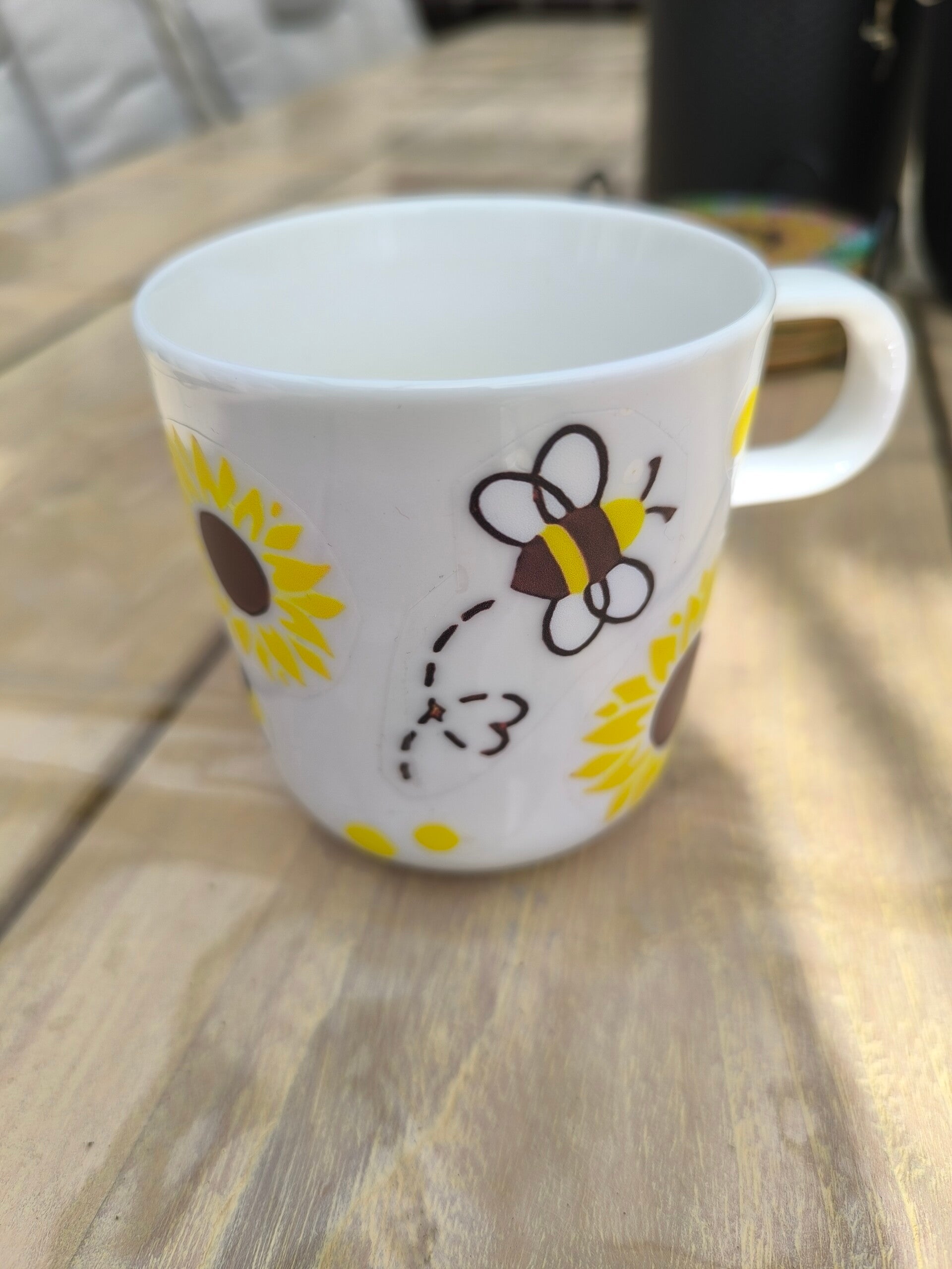Deze porselijnen beker is voorzien van zonnebloemen met bijtjes en hartjes